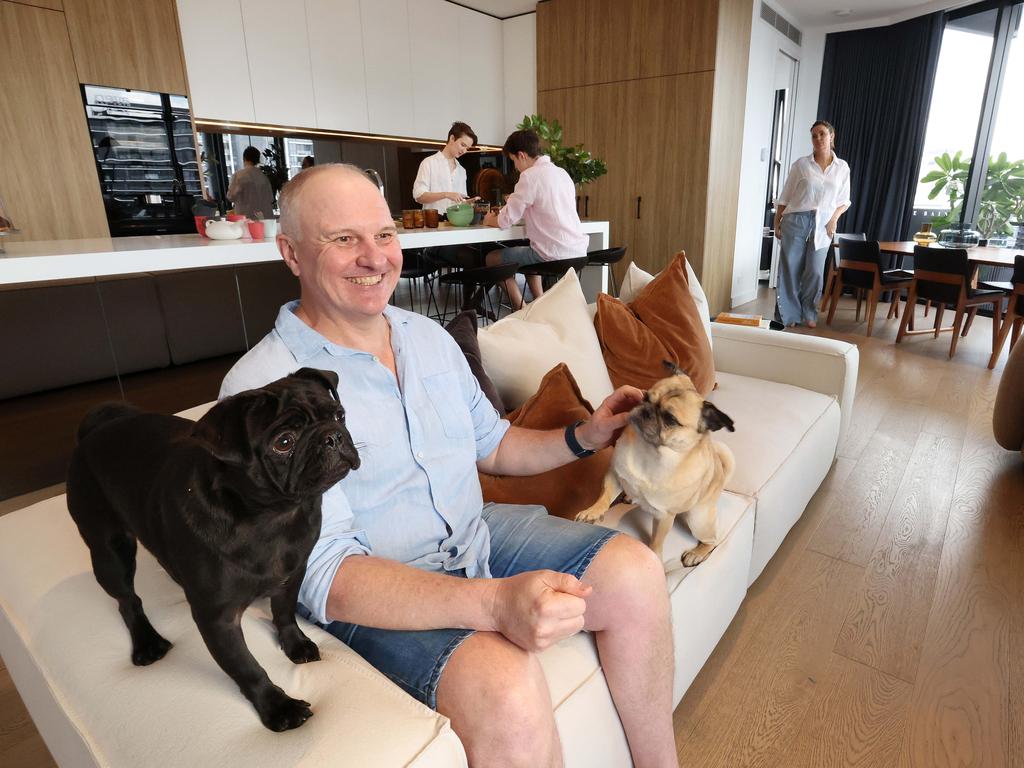 Anthony Sorensen with dogs, Winston and Phoebe, teenage children, Lucinda and Sebastian, and his wife, Maree, in their unit at 1504/20 Wyandra St, Newstead. Picture: Liam Kidston.