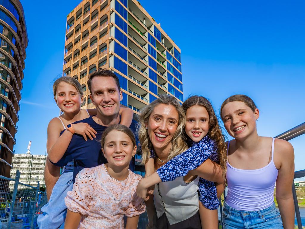 James and Claire MacGinley with their kids, Ella, 13, Millie, 11, Annie, 9, and Charlotte, 7, at Monarch Residences in Toowong, where they are moving into an apartment. Picture: Nigel Hallett.